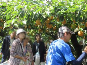 まずはメインの「梨の摘み取り体験」。渡された袋にお名前を書いて、梨の取り方や熟した梨の見極め方などを教えていただき、摘み取りました。梨のジュースがサービスで振舞われてとても美味しかった〜💛