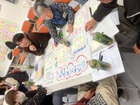 若栗住民の人柄や自然の豊かさを中心にたくさんの良いところが出され、各班で模造紙にまとめるワークショップを行いました。