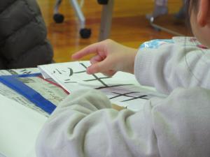 初めての書初め、初めてのクレパスという児童もいるのでおさらいの意味も含めて、手の使い方・クレパスや筆の持ち方・書く時の姿勢などから教わりました。