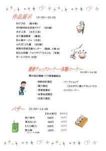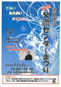 第2回横田地域交流センターまつりを11月1日(土)に開催いたします。普段のサークル活動の発表の場として、横田地域のコミュニティの場として、サークルや地域諸団体の皆様と手を携えて準備を進めております。作品展示や舞台発表、体験コーナー、そして、恒例の?!特別企画 落語高座(三遊亭良楽師匠)やお楽しみ抽選会などもあります。皆様のおいでをお待ちしております。