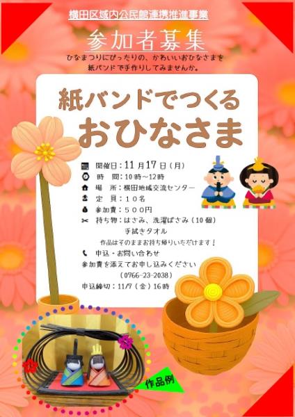 申込み方法 直接横田地域交流センター窓口にて参加費を添えてお申込みください。