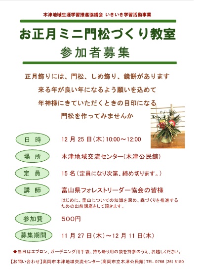 日 時 12月25日(木)10:00〜場 所 木津地域交流センター(木津公民館)定 員 15名(定員になり次第、締め切ります)講 師 富山県フォレストリーダー協会の皆様参 加 費 500円募集期間 11月27日(木)〜12月11日(木)