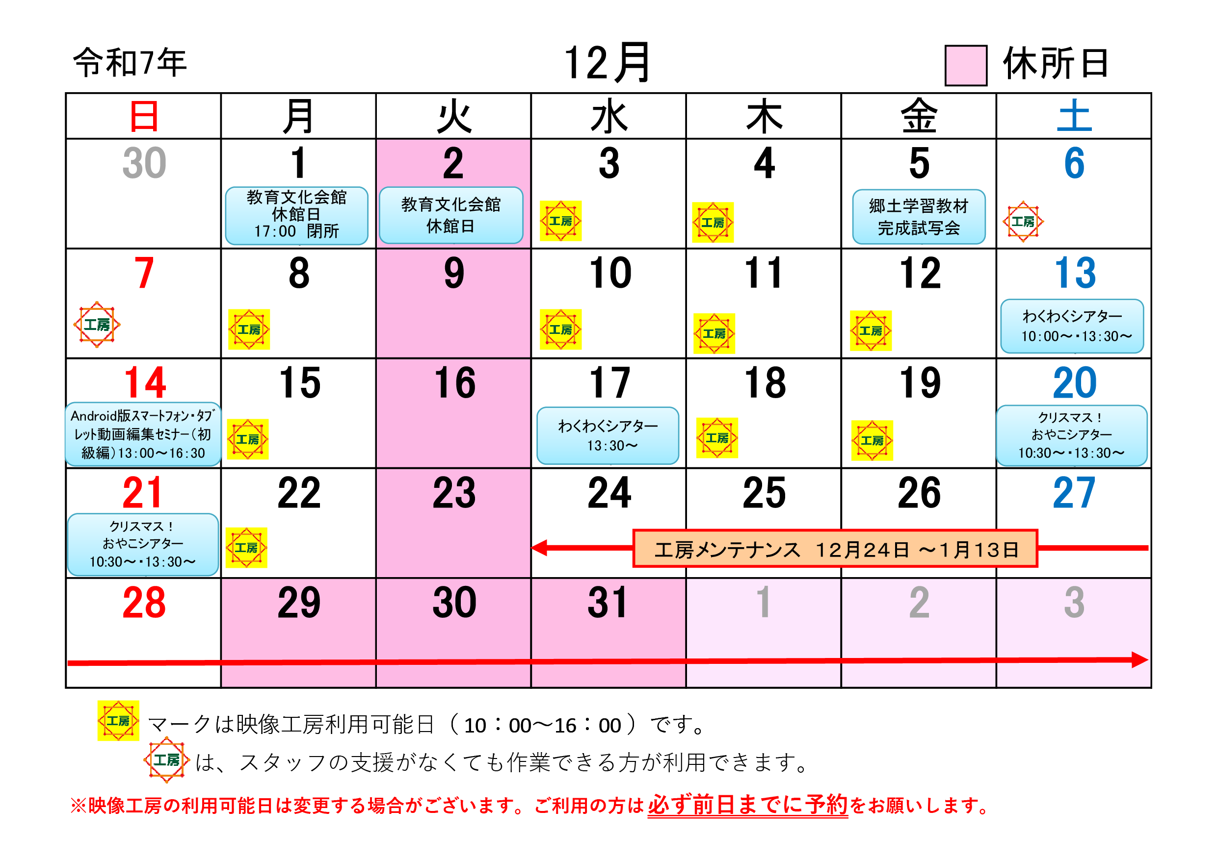 12月映像センターカレンダー [更新日:2025年11月28日] お問い合わせ先 富山県映像センター 〒930-0096 富山市舟橋北町7-1(県教育文化会館) 電話番号:076-441-8455 FAX番号:076-441-5334