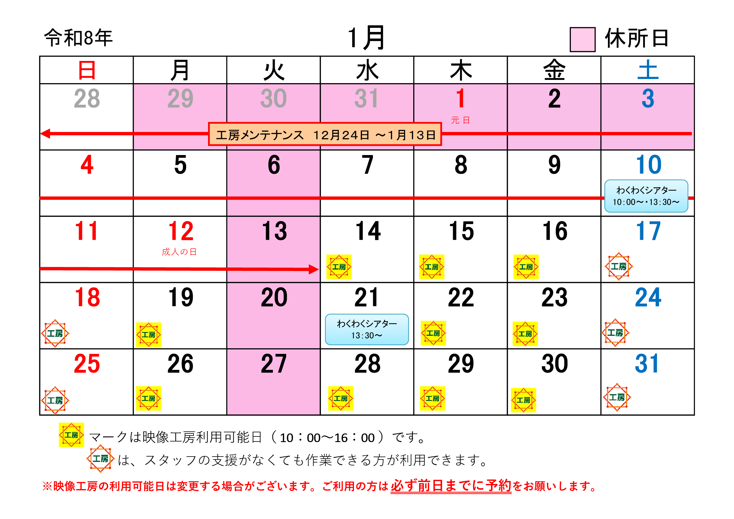 1月映像センターカレンダー [更新日:2025年12月25日] お問い合わせ先 富山県映像センター 〒930-0096 富山市舟橋北町7-1(県教育文化会館) 電話番号:076-441-8455 FAX番号:076-441-5334