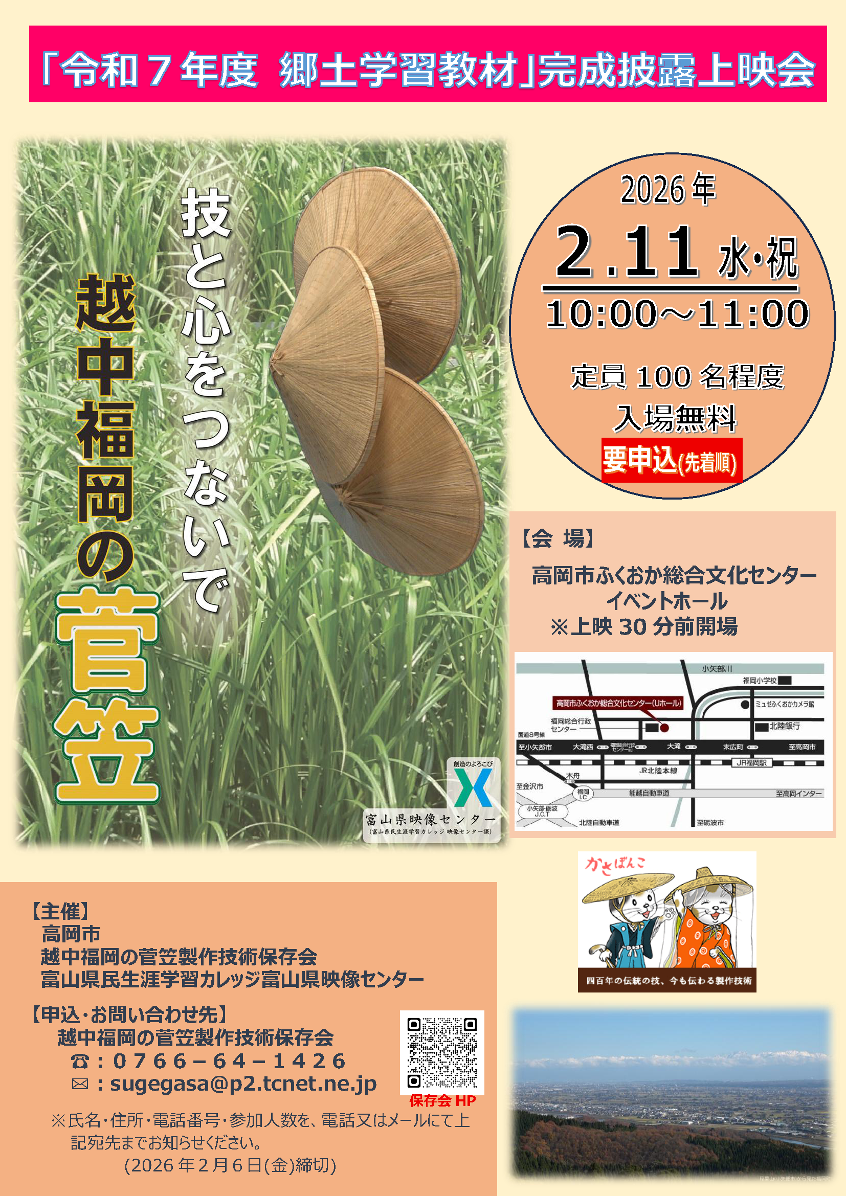 令和7年度 郷土学習教材完成披露上映会を開催します [更新日:2026年1月10日] 県映像センターでは、昭和52年よりふるさと富山の魅力を学ぶ映像作品、郷土学習教材の制作を続けています。先月お知らせしたとおり、第58作品目となる今年度は「技と心をつないで 越中福岡の菅笠」です。2月下旬に一般利用開始となる予定ですが、それに先立ち、制作でたいへんお世話になった高岡市福岡町で、感謝の気持ちを込めて、完成披露上映会を開催することになりました。 ■日時:令和8年2月11日(水・祝)10:00~11:00 開場9:30 ■会場:高岡市ふくおか総合文化センター(Uホール) イベントホール ■参加申込:事前に申込が必要です。越中福岡の菅笠製作技術保存会に、氏名・住所・電話番号・参加人数を、電話又はメールで連絡してください。 詳細はチラシをご覧ください。 ファイル R7郷土学習教材完成披露上映会ポスター.pdf [871 KB] PDFファイルをご覧になるには、Adobe Acrobat Readerが必要です。こちらのバナーから無料でインストールできます。 お問い合わせ先 富山県映像センター 〒930-0096 富山市舟橋北町7-1(県教育文化会館) 電話番号:076-441-8455 FAX番号:076-441-5334