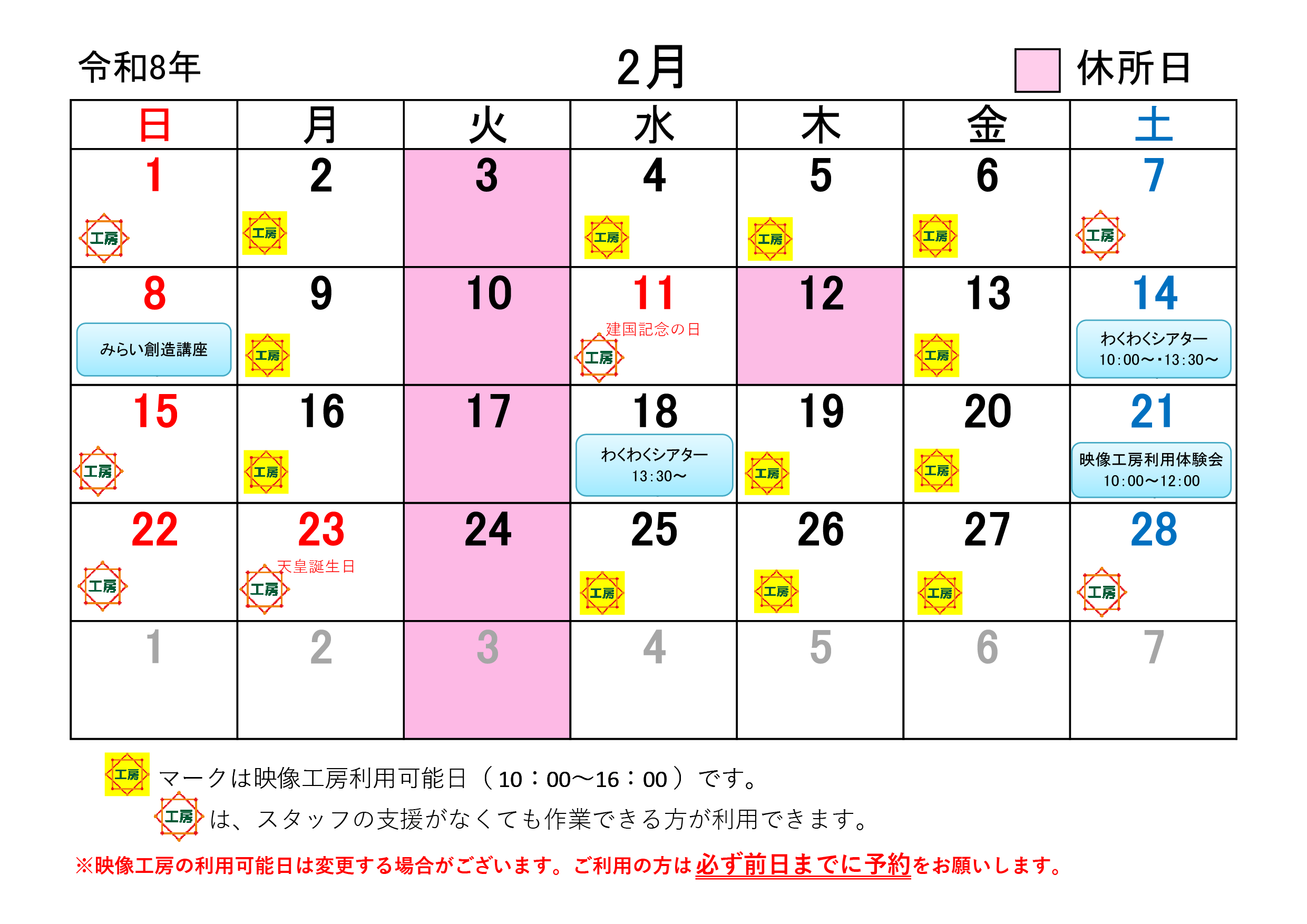 2月映像センターカレンダー [更新日:2026年1月29日] お問い合わせ先 富山県映像センター 〒930-0096 富山市舟橋北町7-1(県教育文化会館) 電話番号:076-441-8455 FAX番号:076-441-5334