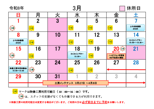 3月映像センターカレンダー [更新日:2026年2月26日] お問い合わせ先 富山県映像センター 〒930-0096 富山市舟橋北町7-1(県教育文化会館) 電話番号:076-441-8455 FAX番号:076-441-5334