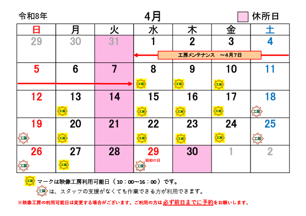 4月映像センターカレンダー [更新日:2026年3月26日] お問い合わせ先 富山県映像センター 〒930-0096 富山市舟橋北町7-1(県教育文化会館) 電話番号:076-441-8455 FAX番号:076-441-5334