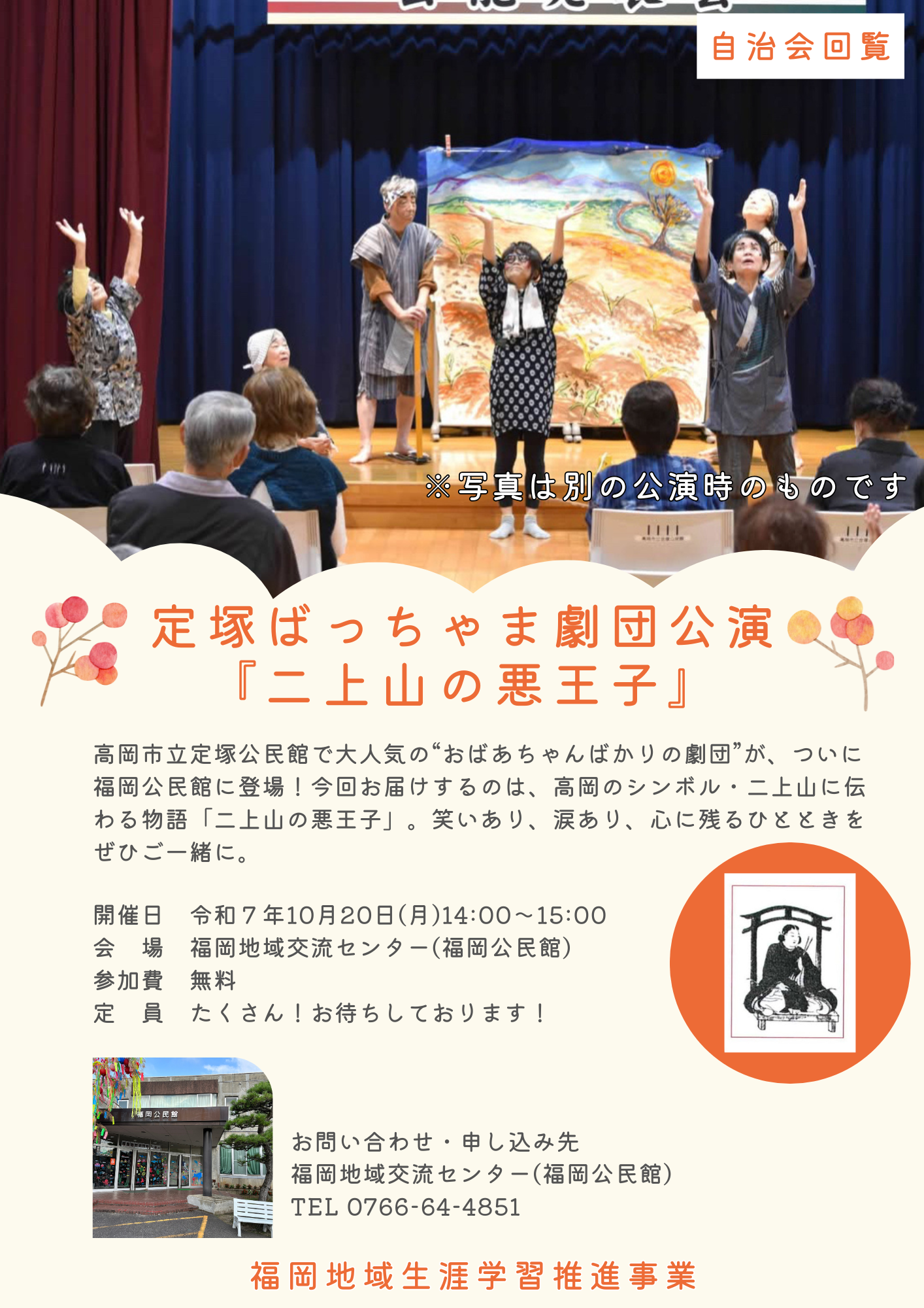 高岡市定塚公民館で大人気の“おばあちゃんばかりの劇団”がついに福岡公民館に登場!今回お届けするのは、高岡のシンボル・二上山に伝わる物語「二上山の悪王子」。