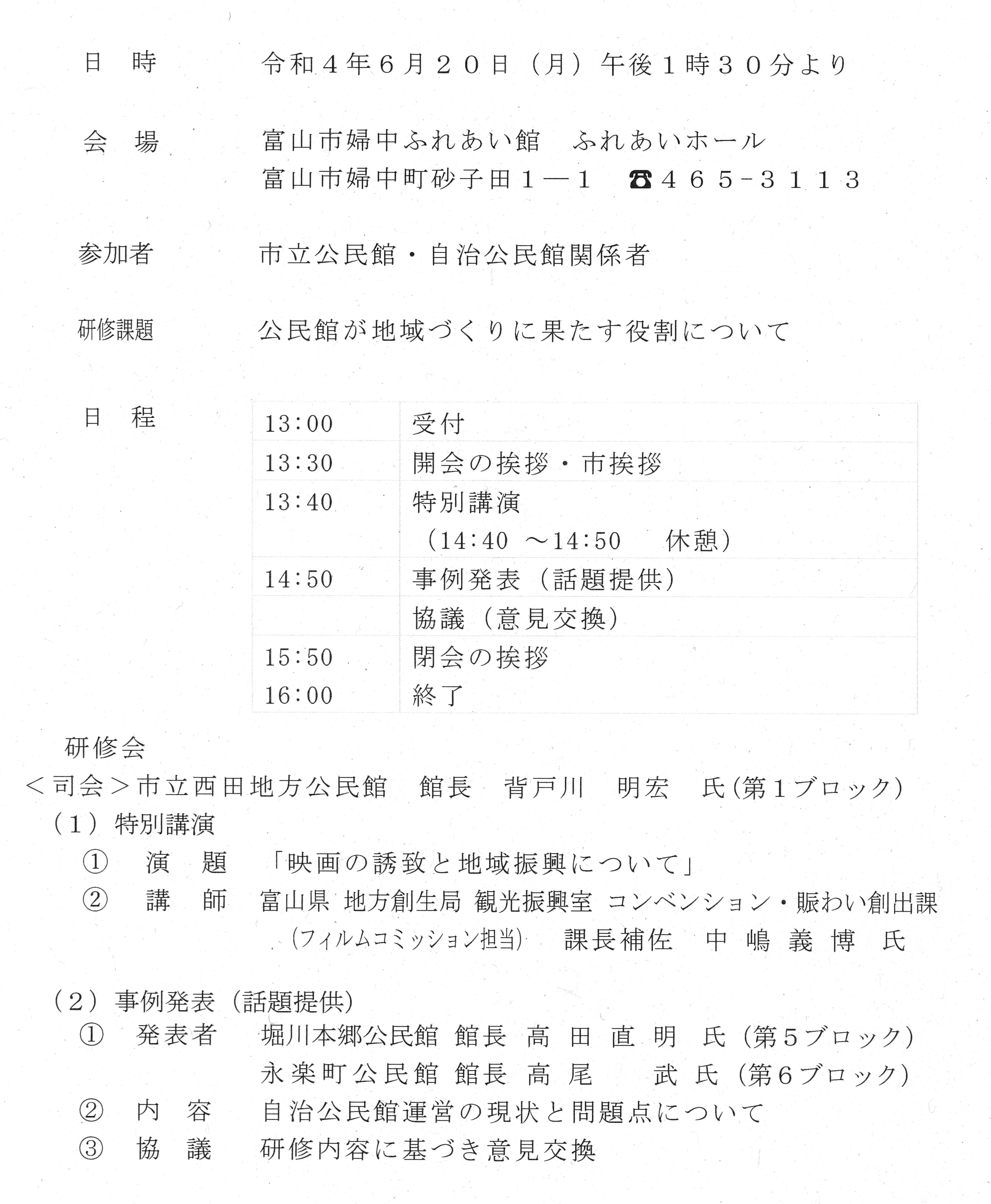 令和4年6月20日、婦中ふれあい館において、富山市公民館研修会(前期)を開催しました。