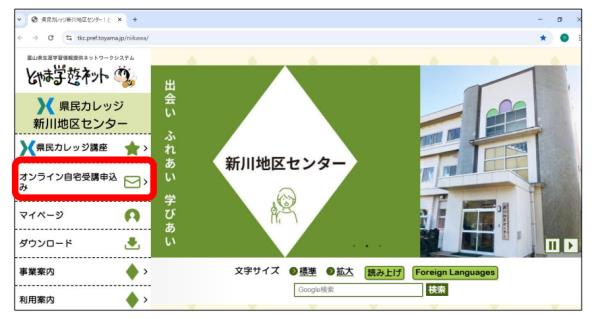 「オンライン自宅受講」申込み受付中! [更新日:2026年2月26日] 自宅にいながら生涯学習を始めてみませんか? 新川地区センターではオンライン自宅受講ができる講座があります。ホームページ「とやま学遊ネット」の新川地区センター トップページ画面左サイドにある「オンライン自宅受講申込み」に必要事項を入力し、お申し込みください。 →→→「オンライン自宅受講」申込み方法はこちら <募集期間> 2月26日(木)~ 3月18日(水) 新川地区センターで「オンライン自宅受講」できる講座 (オンライン自宅受講希望申請入力フォームが開きます。) LSA73 『そこが知りたい!新川の歴史』 LSA74 『知って安心!新川の自然災害とその備え』 ファイル オンライン自宅受講について(ご案内) [344 KB] オンライン自宅受講申込み方法 [476 KB] PDFファイルをご覧になるには、Adobe Acrobat Readerが必要です。こちらのバナーから無料でインストールできます。 お問い合わせ先 新川地区センター 〒937-0011 富山県魚津市木下新144 電話番号:0765-22-4001 FAX番号:0765-22-0901