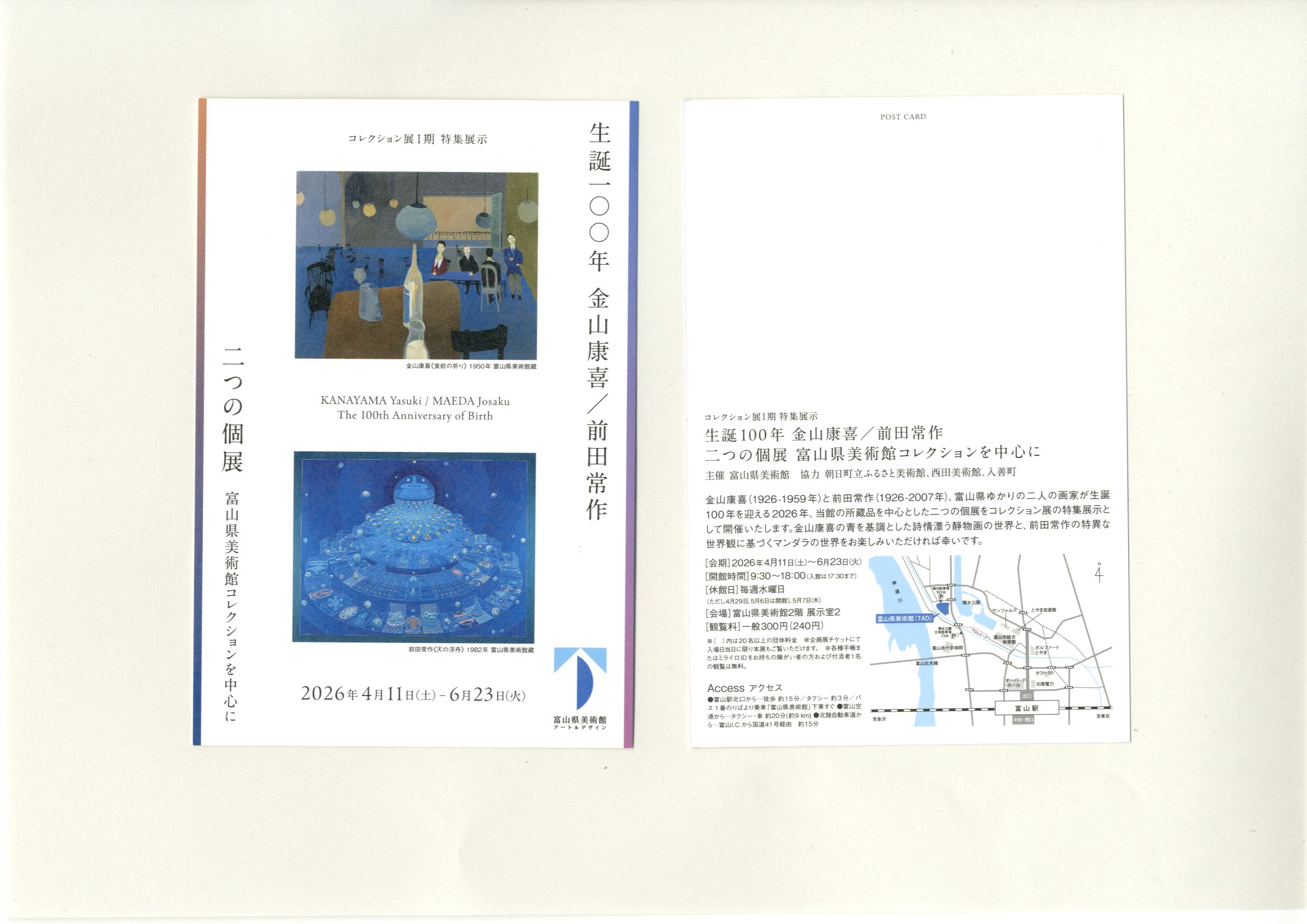 金山康喜(1926-1959年)と前田常作(1926-2007年)、富山県ゆかりの二人の画家が生誕100年を迎える2026年、当館の所蔵品を中心とした二つの個展をコレクション展の特集展示として開催いたします。金山康喜の青を基調とした詩情漂う静物画の世界と、前田常作の特異な世界観に基づくマンダラの世界をお楽しみいただければ幸いです。