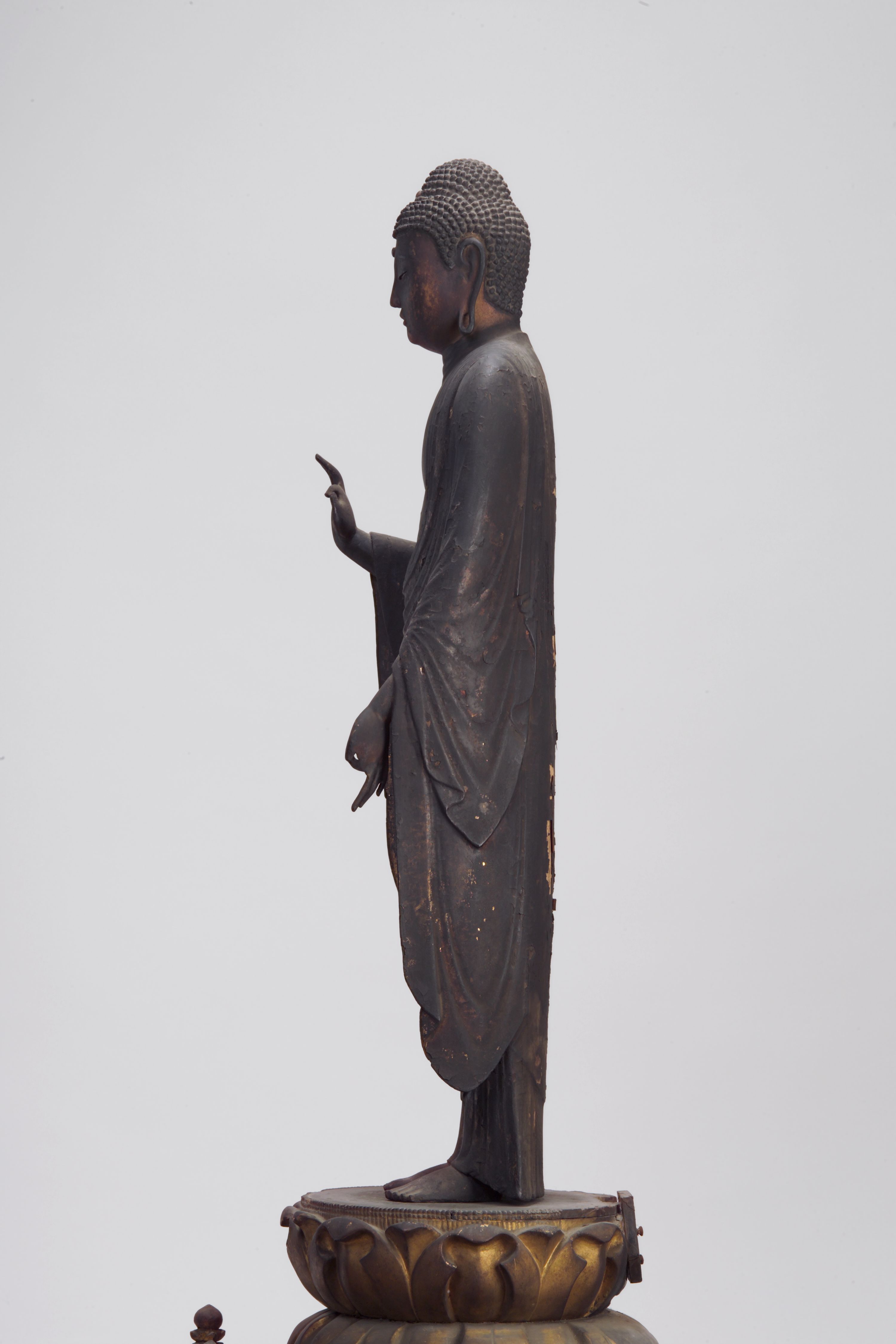 眼が水晶、白毫という眉間にある飾りも水晶、それに頭の正面にもメノウの飾りをはめる。丸い顔で鼻が高く、口がきりっとし、身体のおだやかな形や衣服のこまかな表現もみごとである。よほど有名な仏師の手になるのであろう。鎌倉時代初期につくらたと考えられるすぐれた仏像である。