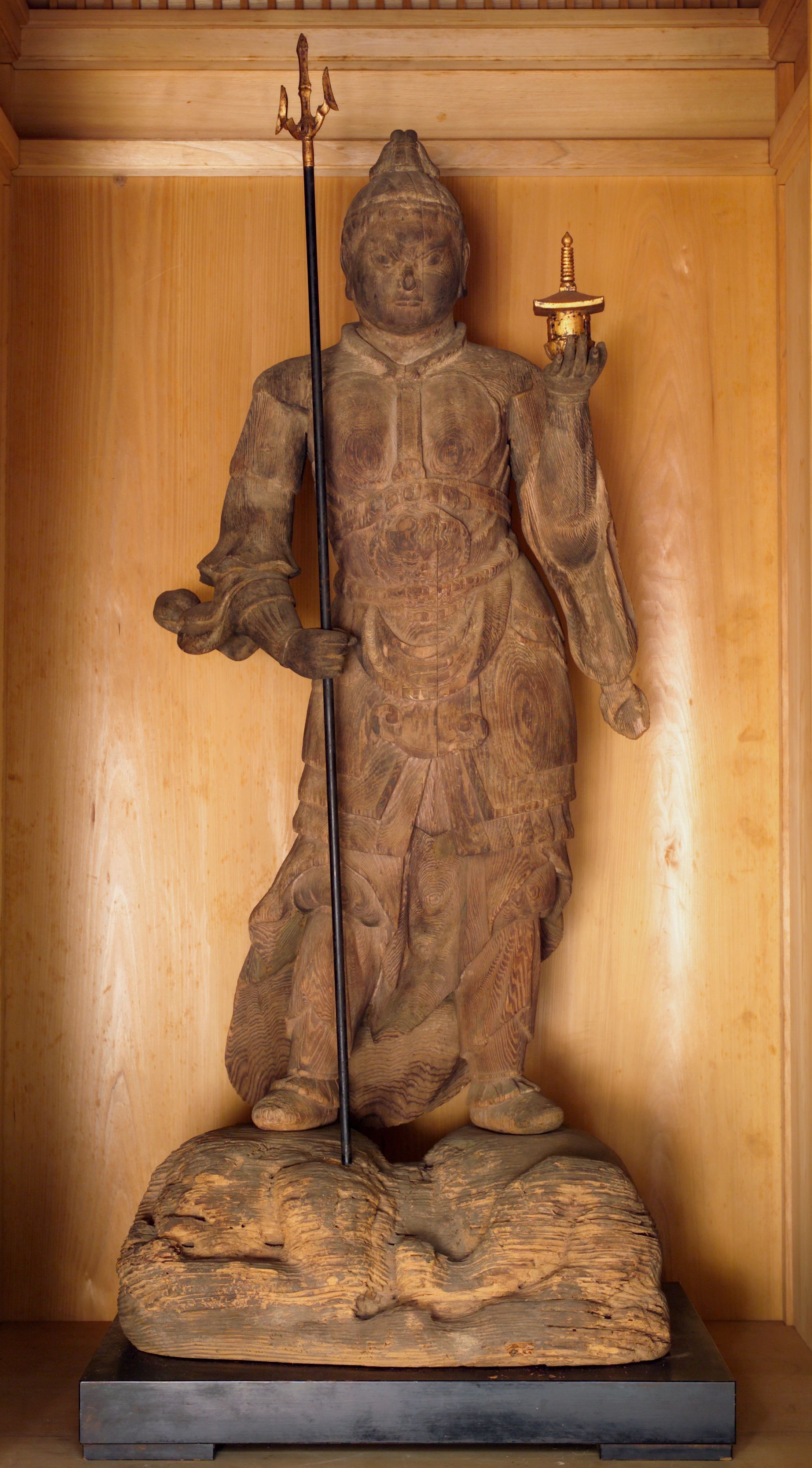 高さ110cmの立ち姿の像で、ヒノキで部分ごとにつくって合わせてある。軍服をまとって武器を持ち、さらに小さな鬼をふみつけているが、お顔もからだつきもやさしいのが特色である。