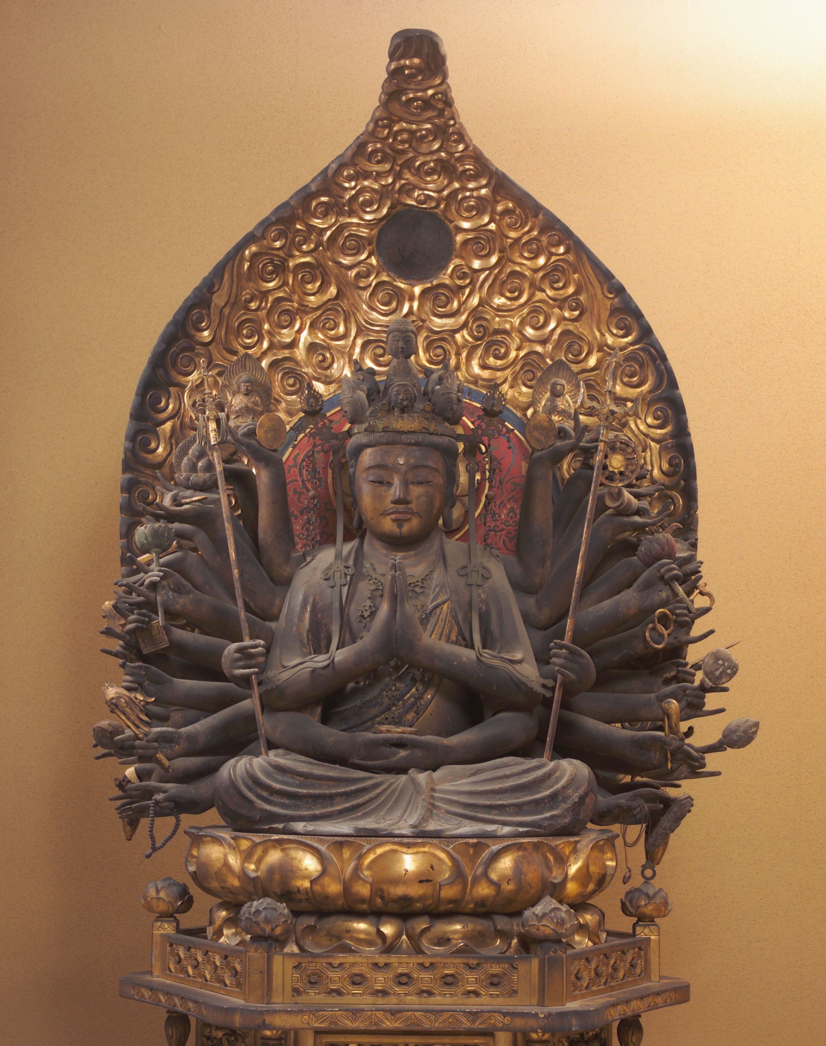 ヒノキで部分ごとに作って合わせた高さ81.5cmの坐った姿の像である。手は24本、頭の上には11個の小さな仏像の顔をつける普通に見る千手観音である。