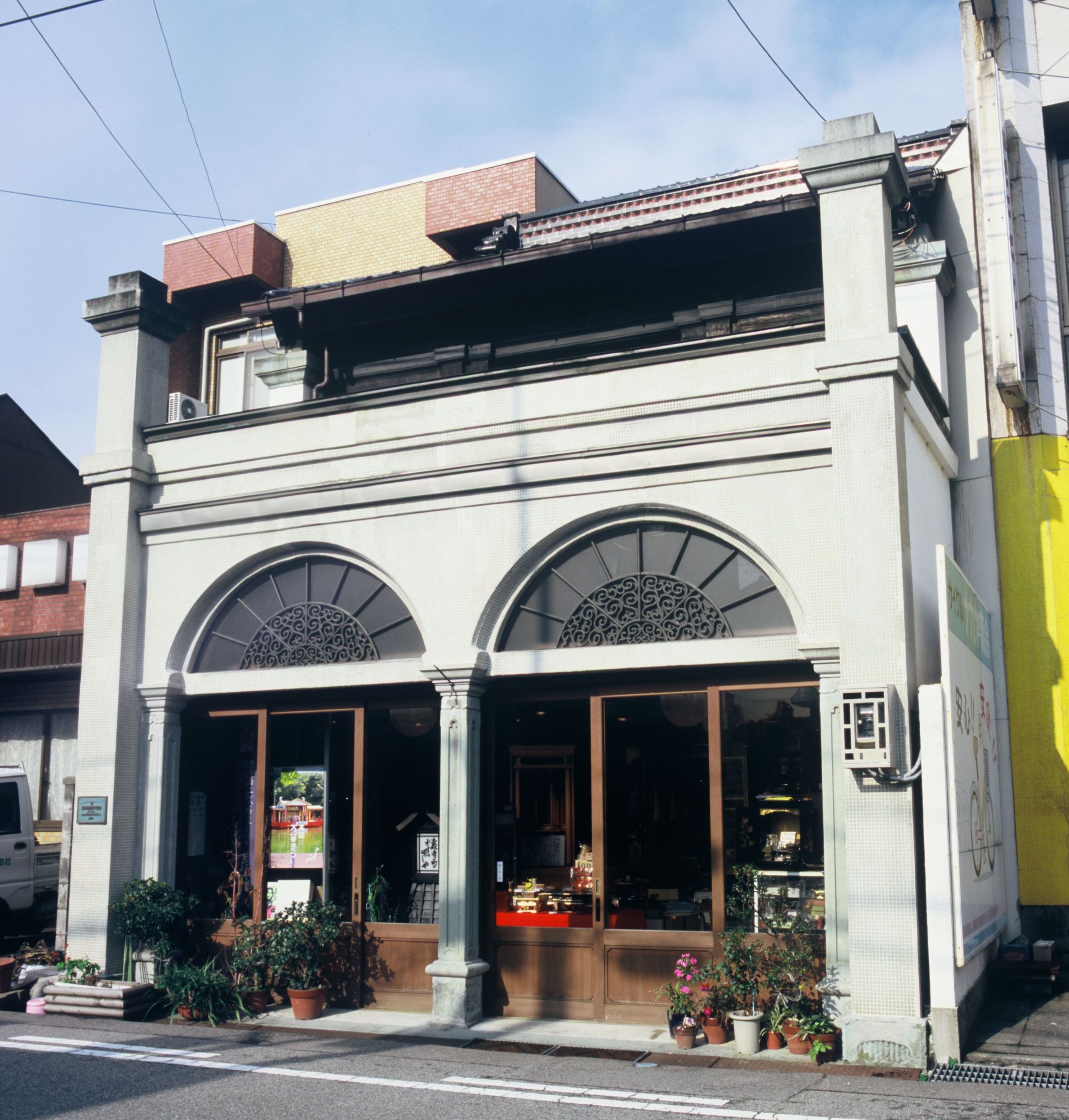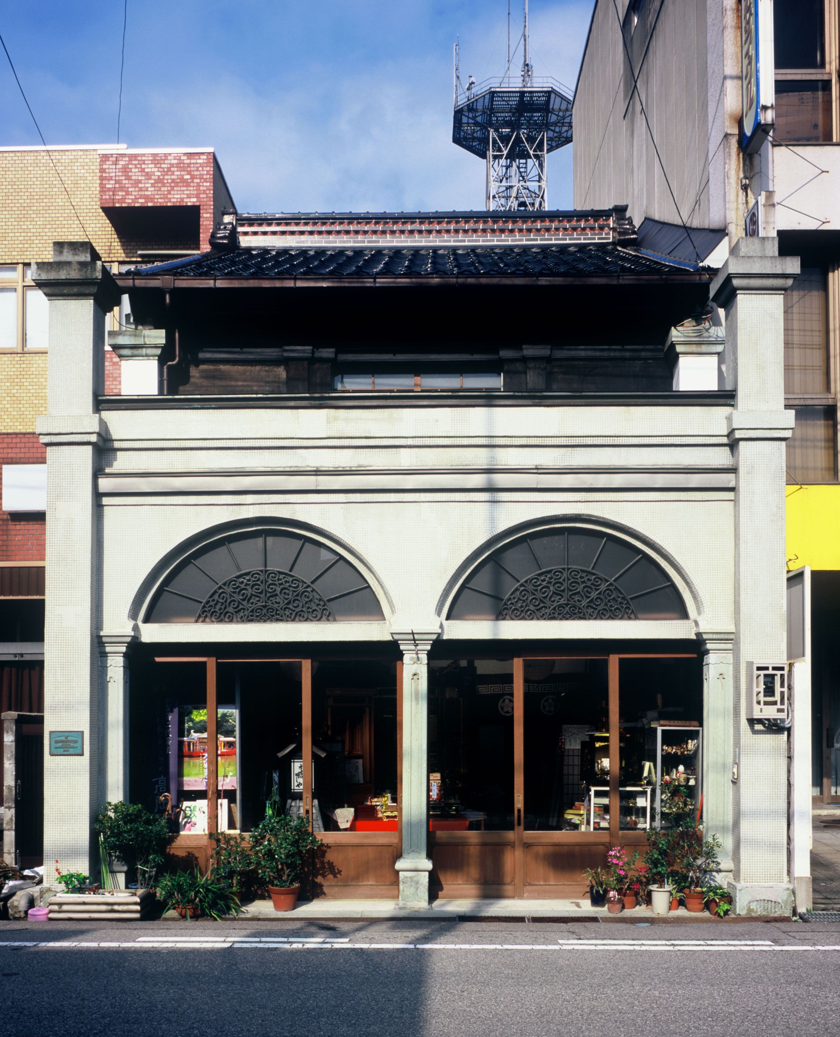 正面意匠は鋳物製の唐草模様で飾る大きなアーチ窓を置く独特なデザインになり、明治後期の店舗として親しまれている。