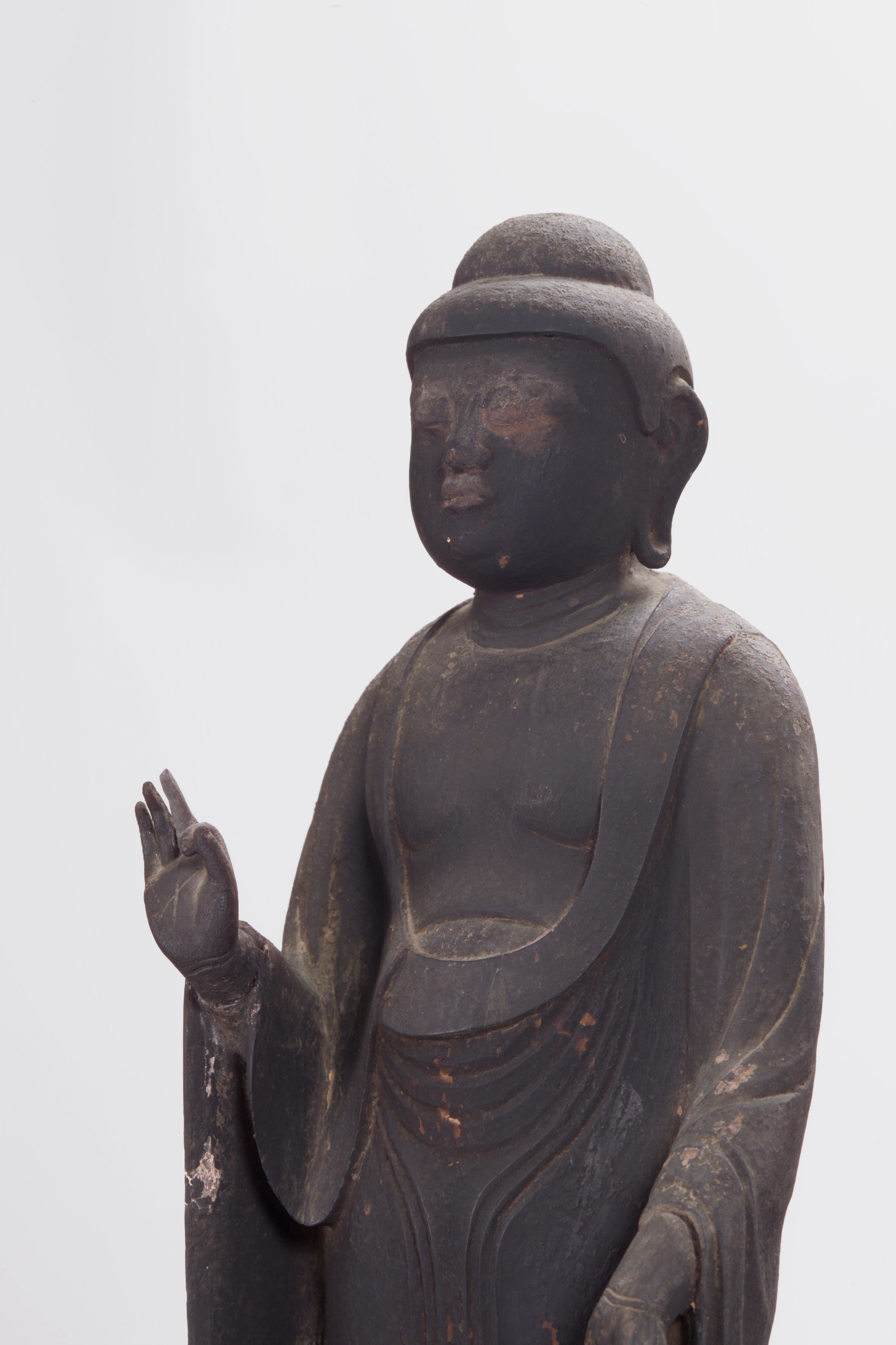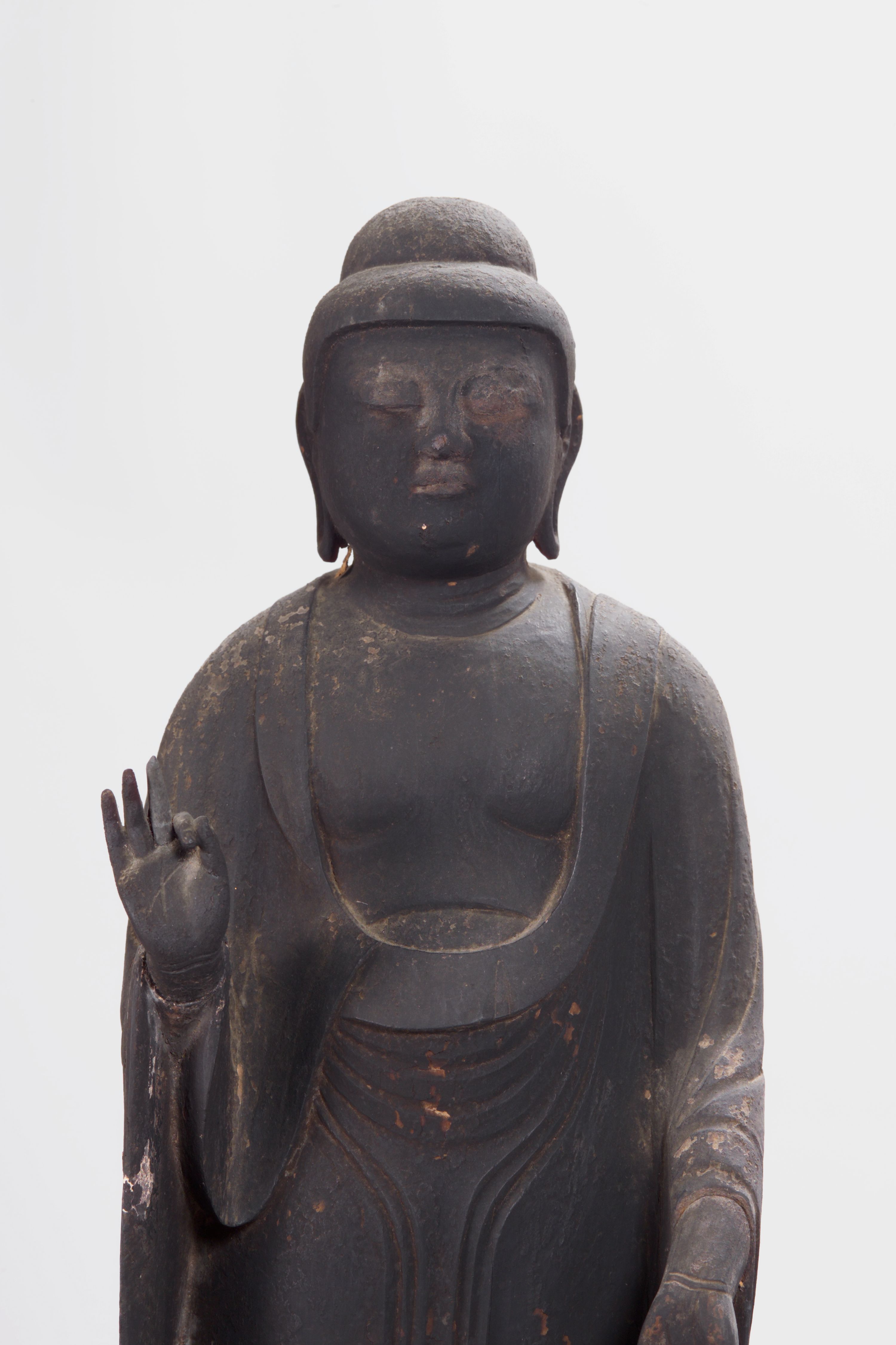 1本のヒノキでつくった高さ51.5cmの立った姿の像である。全身まっ黒で、頭には髪の表現がなく、衣服の刻み方も浅い。豊かな顔ながら鼻や口が小さく、やさしく、いかにも極楽浄土の仏様らしい。ただし、両手両足の先はあとで補われたものである。