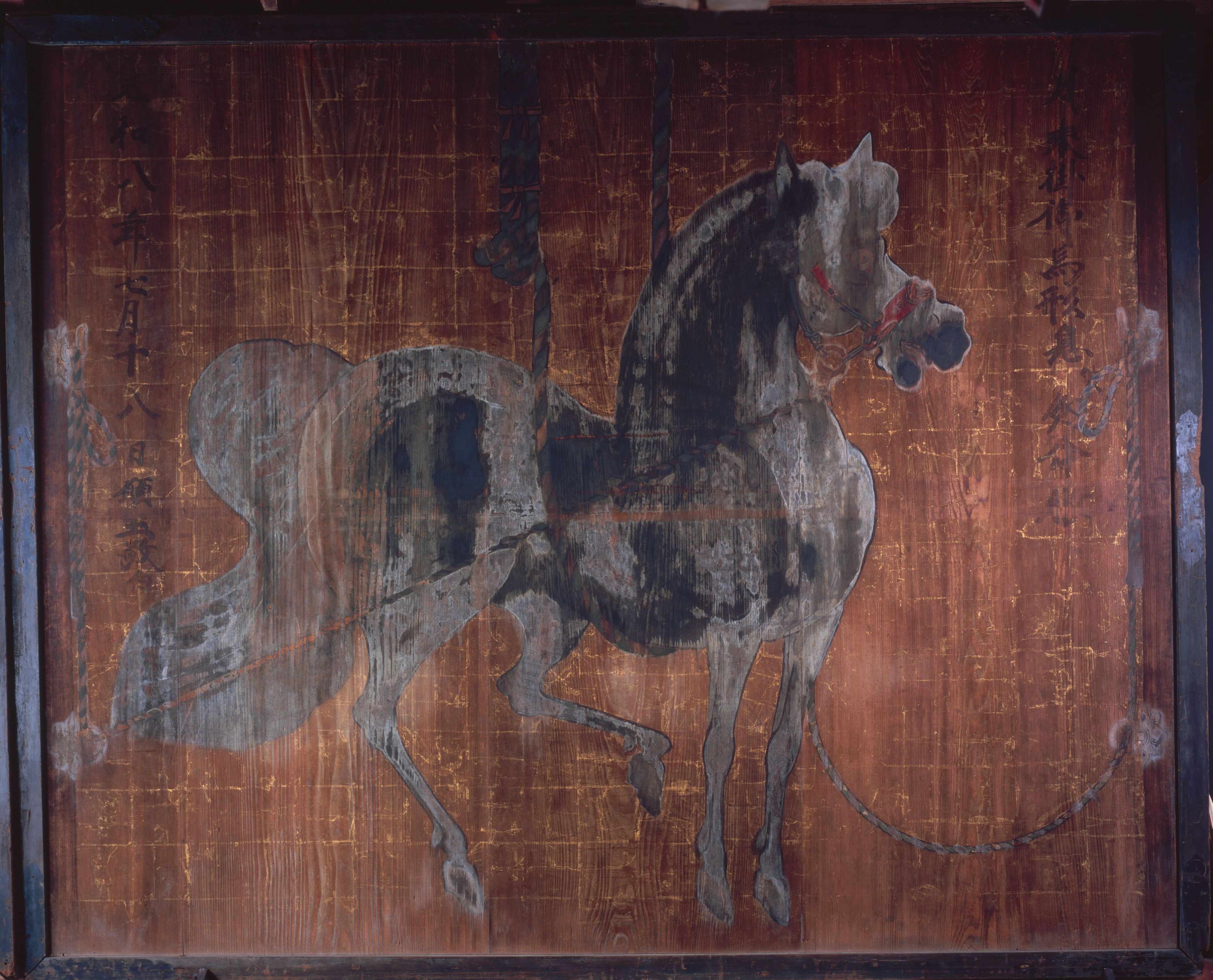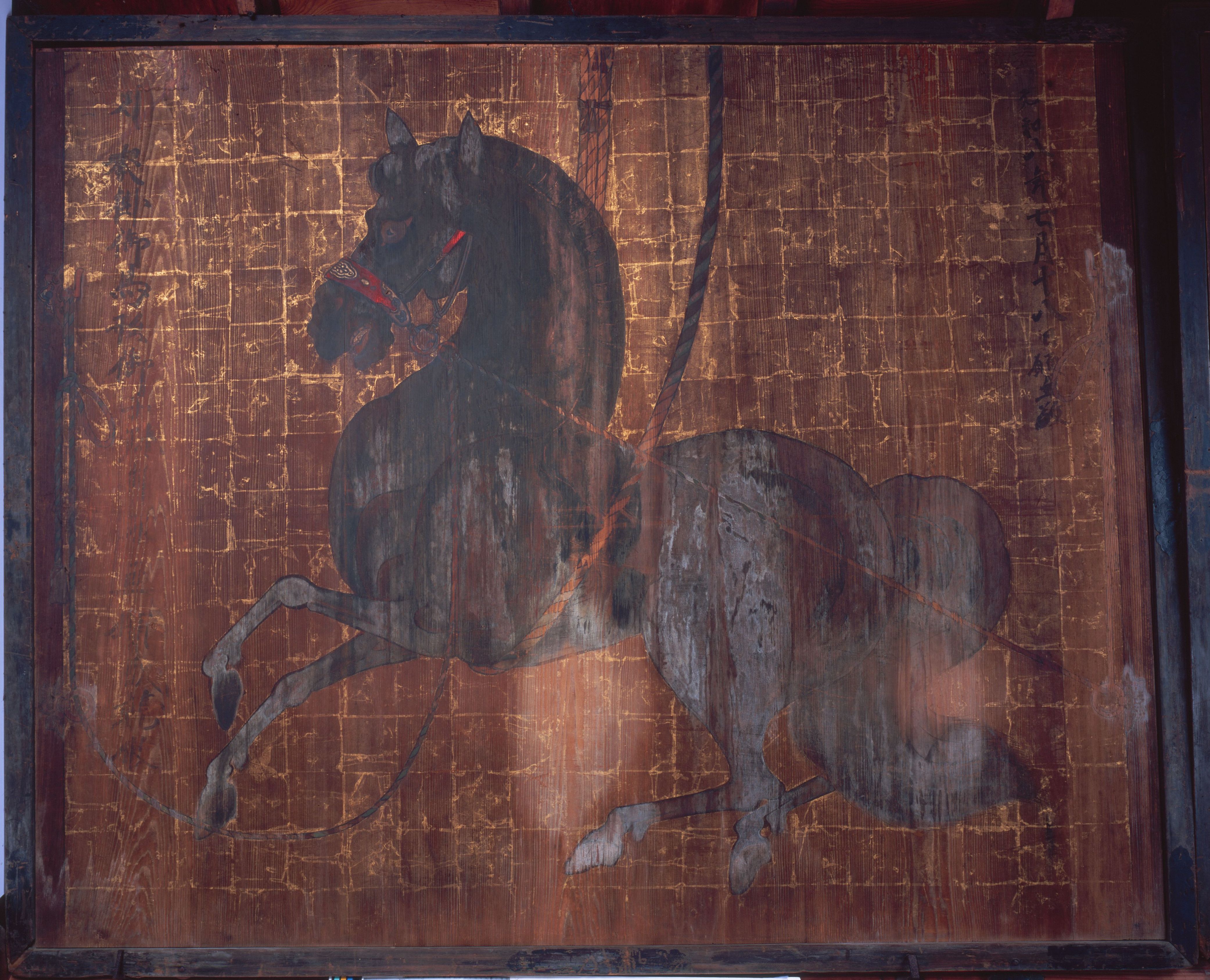 桃山時代の作で狩野永徳、三楽、師弟の作と伝え、檜材の板壁に水墨をもって画いたもの。3面あり、下カマチに車の輪をつけてあるので、伝説の聚楽第長廊下の板戸を思わせる。