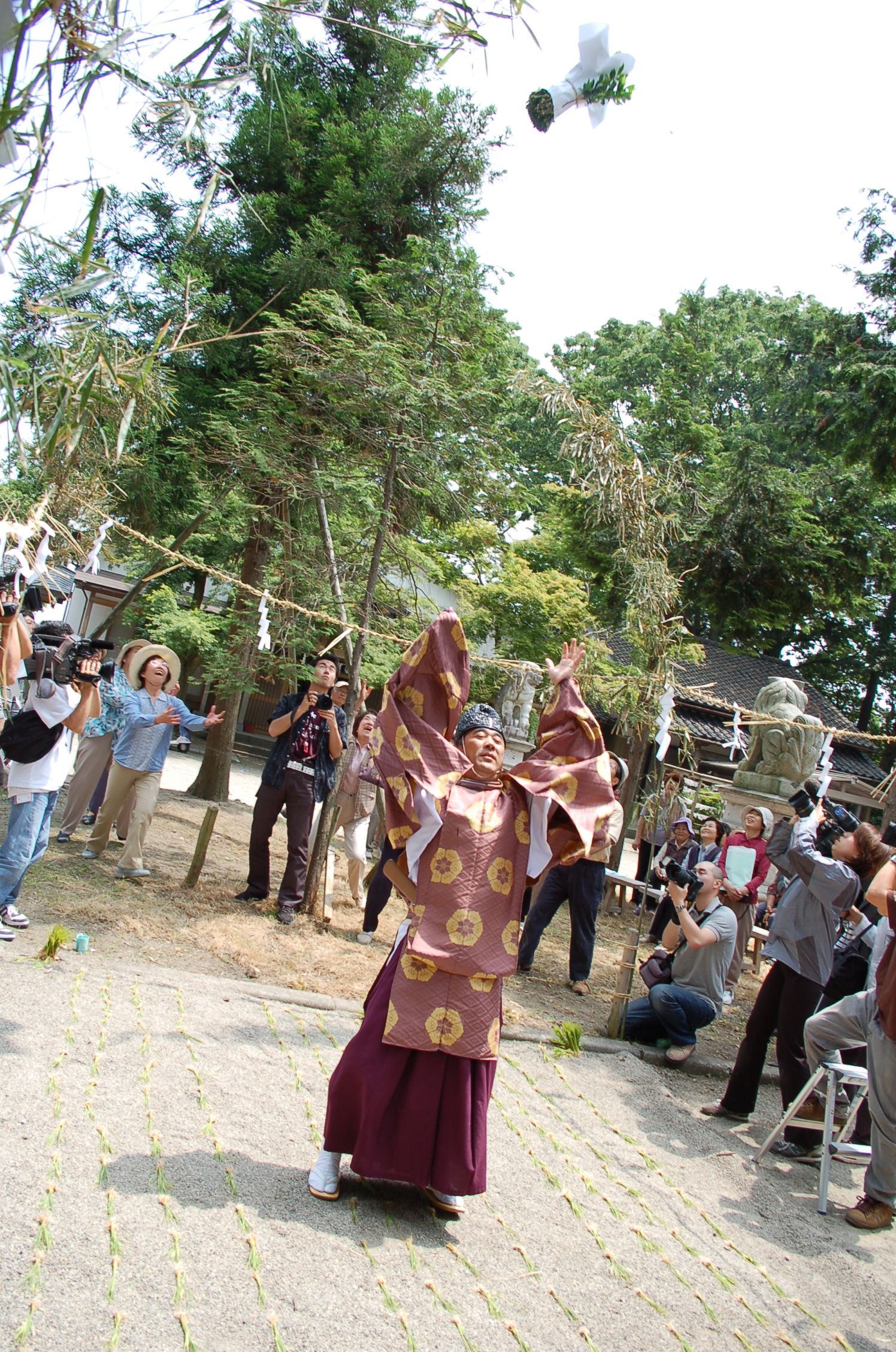 田植えの後、十把の真菰(まごも)で作った2体1組の「大男」の人形を後ろへ投げ上げるが、それを拾った人は豊作になるといわれ参詣者は競って拾い合う。