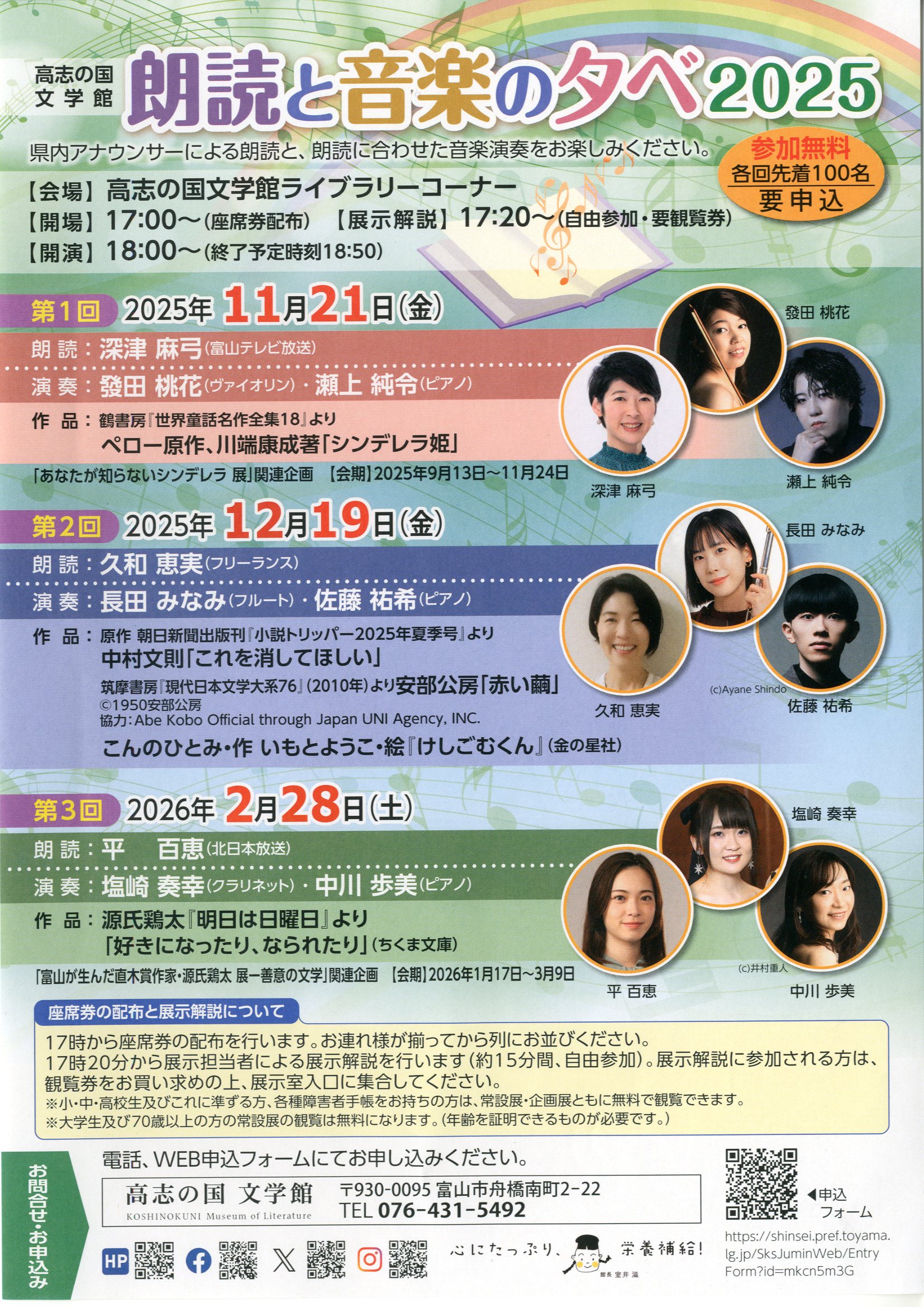 県内アナウンサーによる朗読と、朗読に合わせた音楽演奏をお楽しみください。