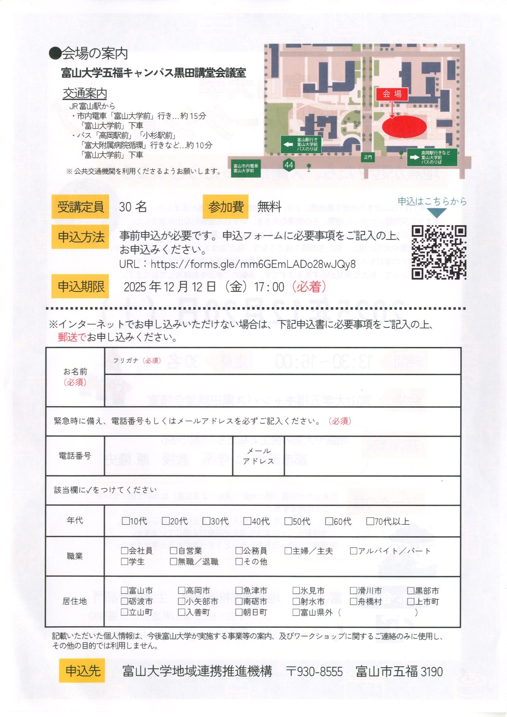 富山大学 地域連携推進機構 〒930-8555 富山市五福 3190 TEL 076-445-6956 メール lifelong@ctg.u-toyama.ac.jp
