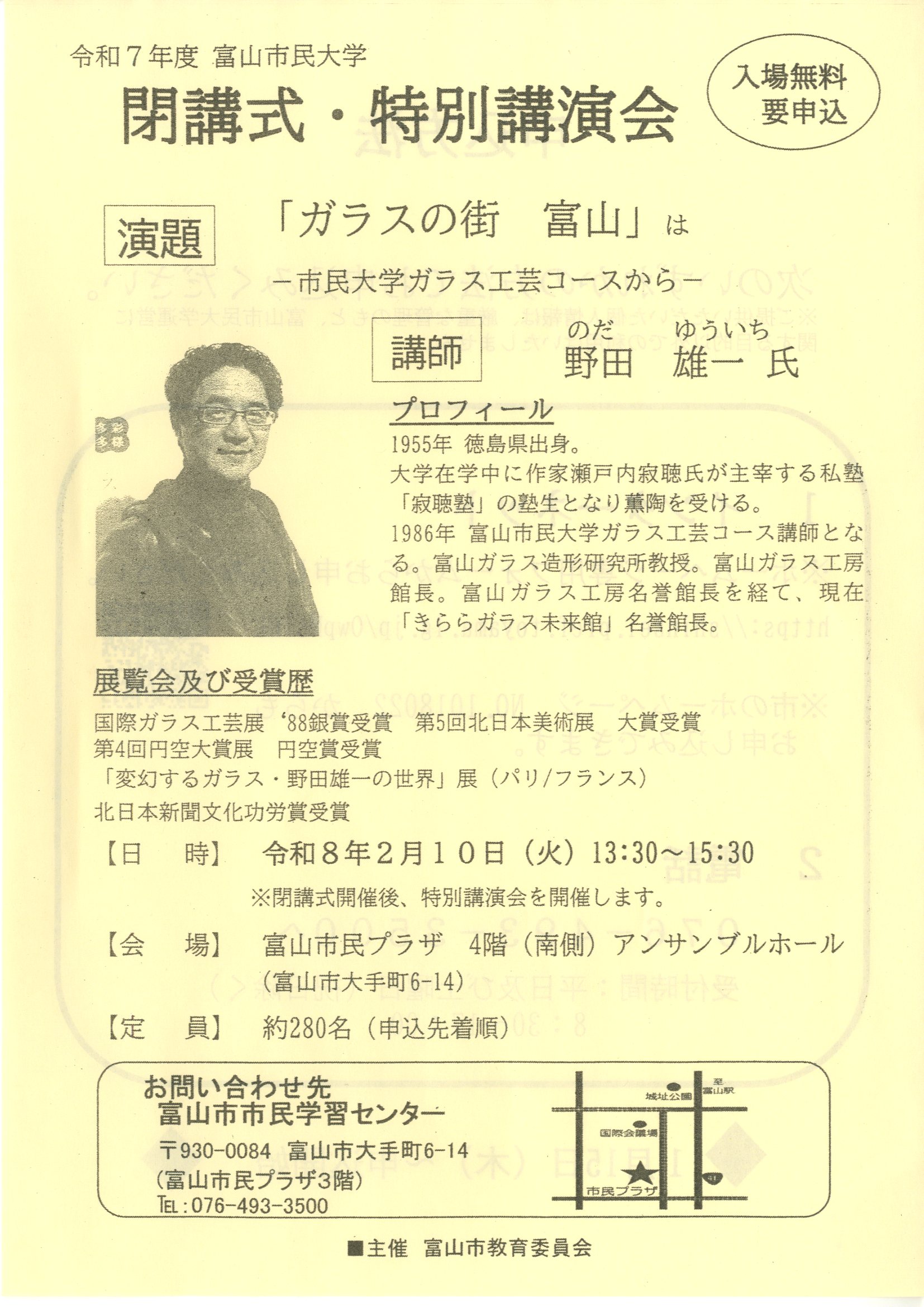 富山市市民学習センター 〒930-0084 富山市大手町6番14号 (富山市民プラザ 3階) TEL 076-493-3500