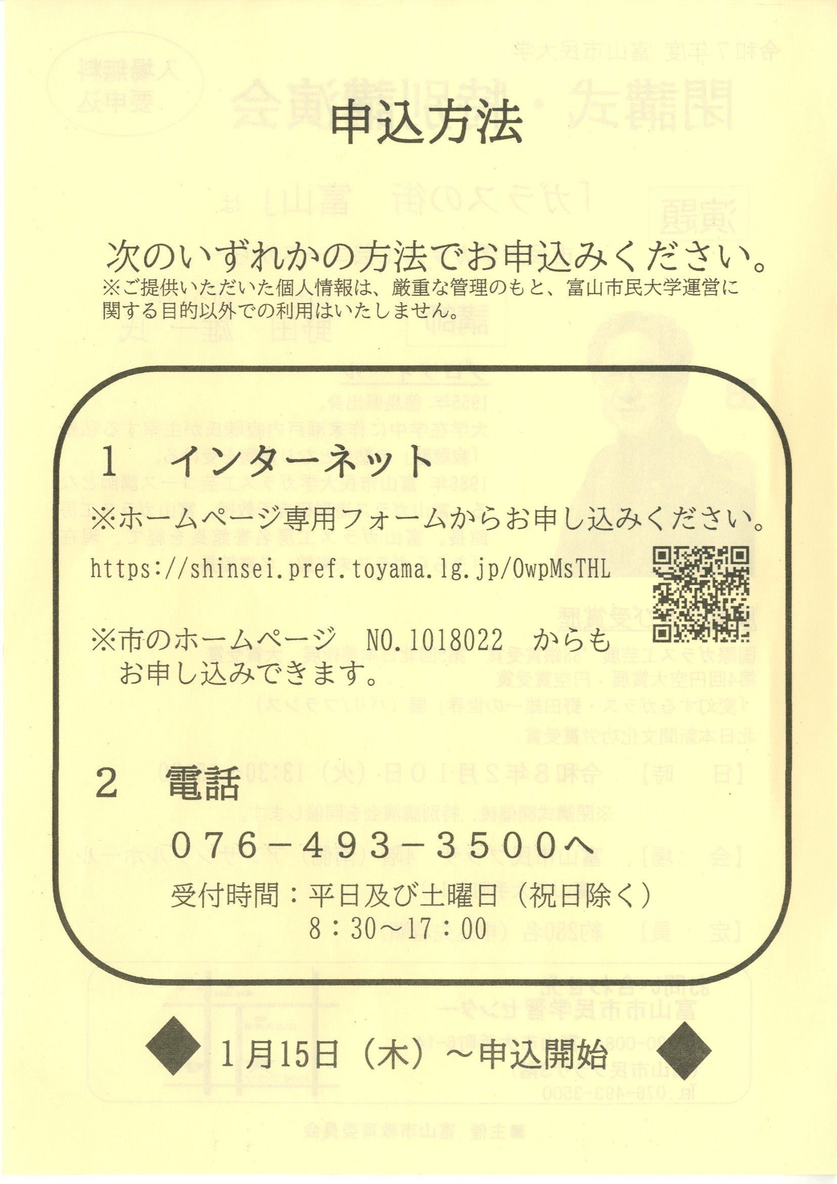 TEL 076-493-3500 (受付時間:平日及び土曜日(祝日除く)