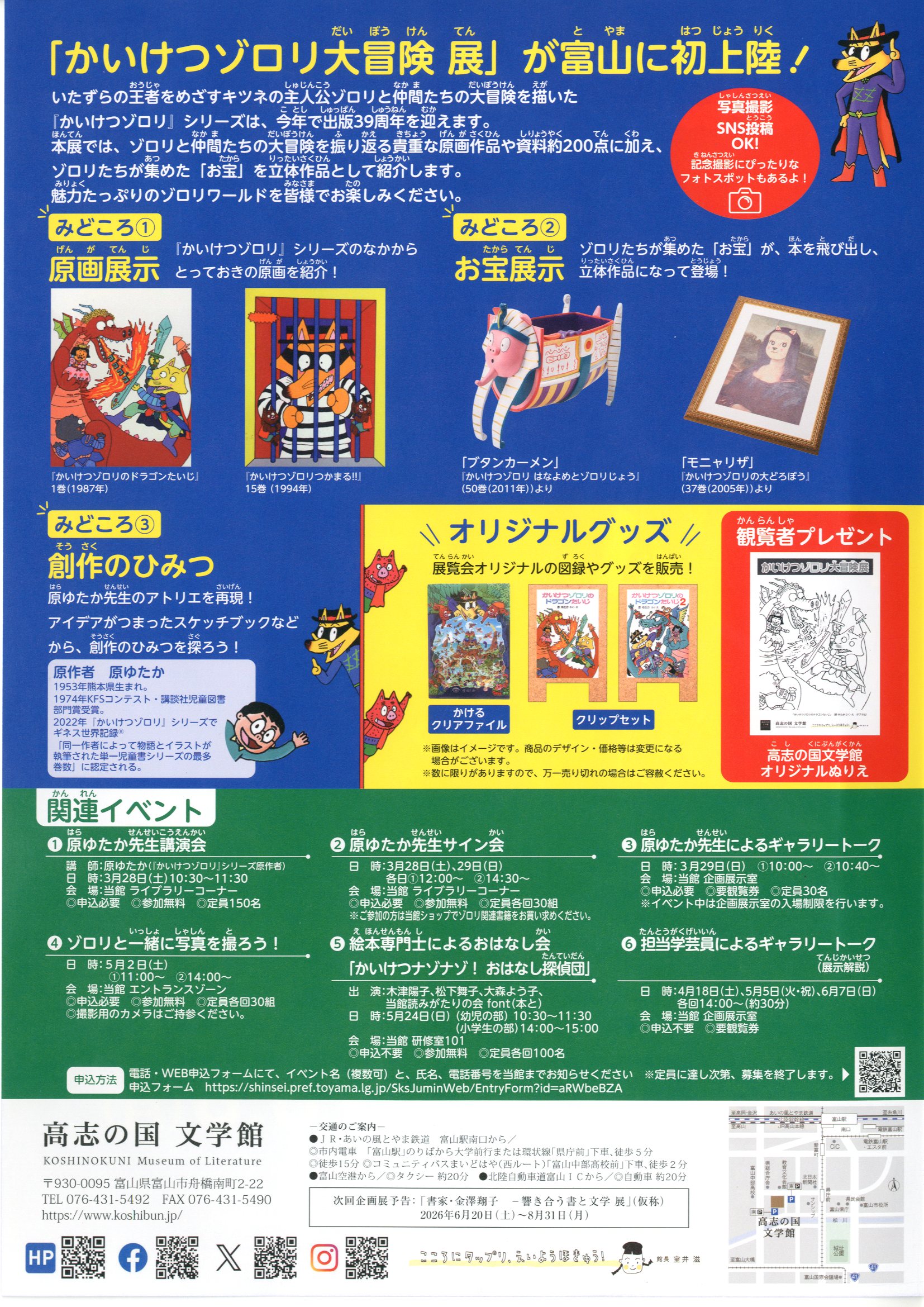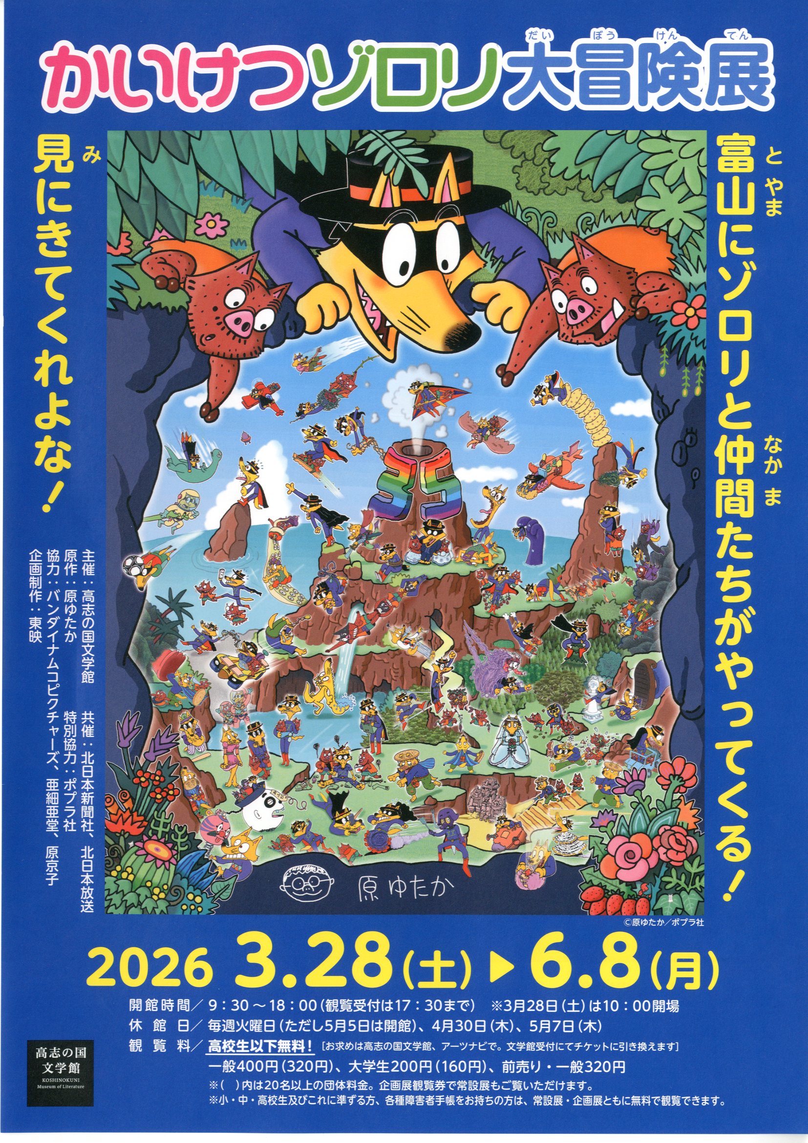 日 時/3月28日(土)10:30~11:30 ◎定員150名 ■原ゆたか先生サイン会 日 時/3月28日(土)、29日(日) ◎各日①12:00~②14:30~◎定員各回30組(先着順) ※ご参加の方は当館ショップでゾロリ関連書籍をお買い求めください。 ■原ゆたか先生によるギャラリートーク 【定員に達しました】 ■ゾロリと一緒に写真を撮ろう! 日 時/5月2日(土)①11:00~②14:00~ ◎定員各回30組 ※撮影用のカメラはご持参ください。 |