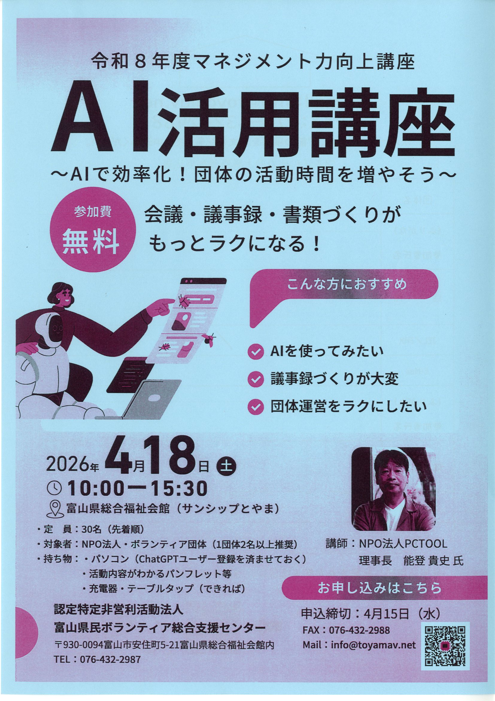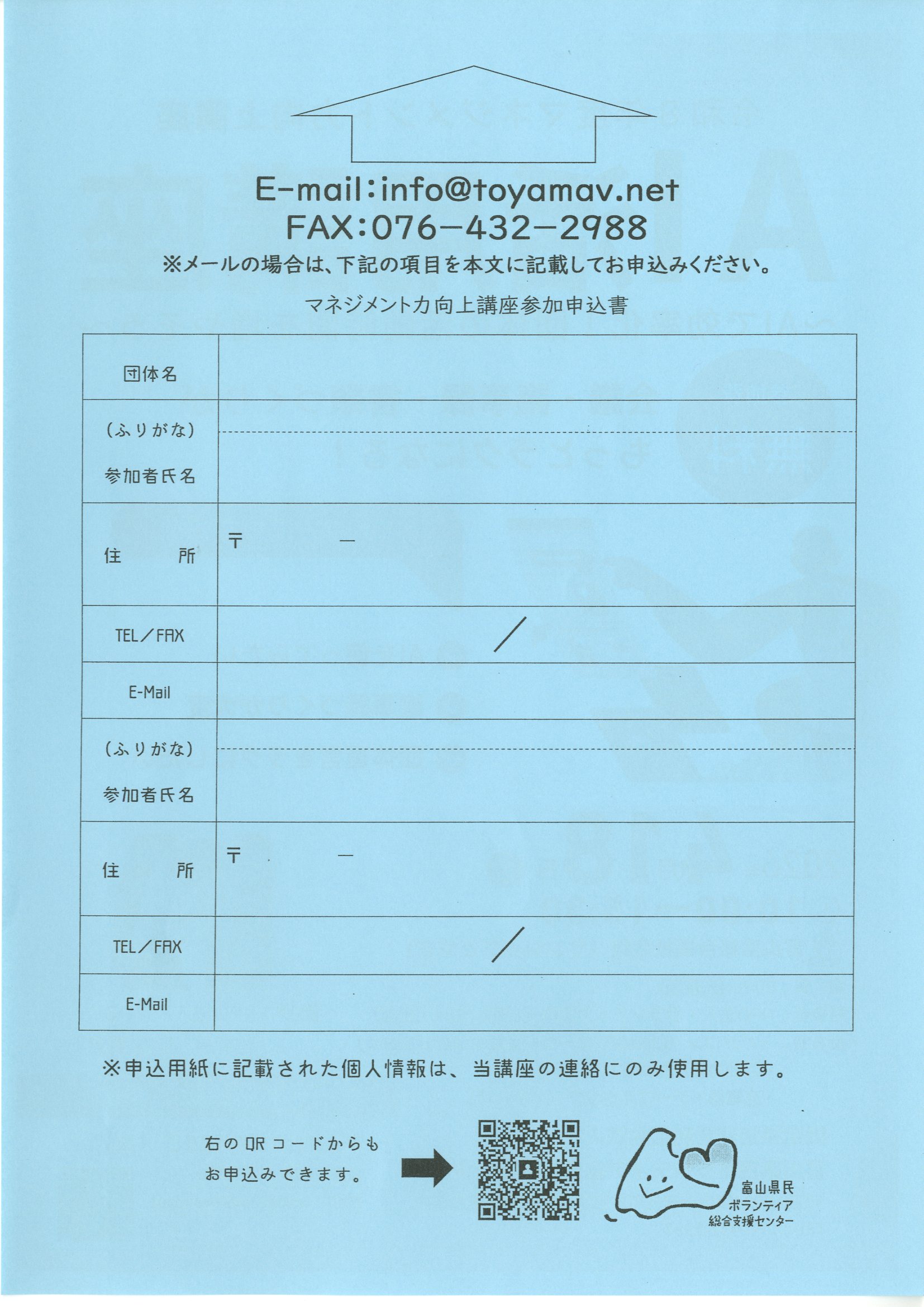 認定NPO法人富山県民ボランティア総合支援センター 〒930-0094 富山市安住町5-21(サンシップとやま内) TEL 076-432-2987 FAX 076-432-2988 メール info@toyamav.net