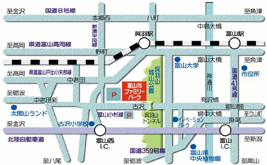 鉄道・バス=JR富山駅下車、富大附属病院循環バス20分、ファミリーパーク前下車すぐ