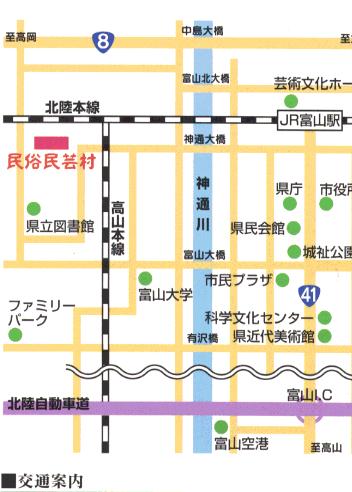 ・路線バス 富山駅⑦のりばから乗車 富山地方鉄道バス「新桜谷町」行から「安養坊」 または「富山市民俗民芸村」下車 徒歩5分 |
