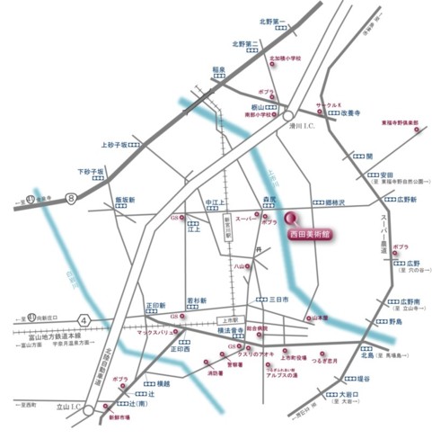 《富山方面から》 ・国道8号線「上砂子坂」交差点を右折。→「中江上」交差点を左折。(約15分) 《魚津方面から》 ・国道8号線「北野第二」交差点を左折。→「郷柿沢」交差点を右折。(約15分) 鉄道をご利用の場合 ・富山地方鉄道「新宮川駅」下車→徒歩約15分 ・富山地方鉄道「上市駅」下車→タクシーで約5分 |