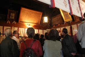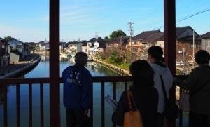 LAC31「人々の暮らしと寺社」第2回を実施しました。 [更新日:2025年11月5日] 日 時 令和7年10月30日(木)13:30~15:30 会 場 放生津八幡宮、内川周辺 内 容 放生津八幡宮、内川を訪ねる 講 師 放生津八幡宮 宮司 大伴 泰史 氏 いきいき観光ボランティア 新湊「あゆの風」の方々 【講座の概要】 前半は放生津八幡宮を訪ね、大伴宮司より大伴家持卿碑文を基にした放生津八幡宮の由緒についてお話しいただいた。その後、拝殿内に掲げられている地元の方々から奉納された奉納額や絵馬について一つ一つ詳しくご説明いただき、「昆布の絵馬」や「組桶細工」の額などの珍しいもの、色鮮やかな植物が描かれた「天井画」や学問の発展を祈念した「算額」などを見学した。 後半は新湊「あゆの風」の3名のボランティアガイドの方々の案内により、放生津地域の街並みや内川周辺の散策を行った。1班9名程度の少人数でガイドをしていただいたことで、より身近に詳しく新湊の歴史や内川周辺の魅力を知ることができた。東橋からの景観、係留されている漁船にかかわる話、山王橋の「手」の彫刻、川の駅新湊に展示されている豪華絢爛な曳山などに受講者は興味を抱いた様子であった。 【受講者の感想】 ・拝殿内を見学させていただきありがとうございました。築山神事の時にまたお参りをさせていただきたいと思います。 ・放生津八幡宮の絵馬等がすばらしかった。内川の散策で歴史について知ることができ、ガイドさんの説明も楽しかった。また来てみたい。 ・同じ県内に住んでいてもなかなかゆっくり歩いたこともなかったのですが、すばらしかったです。八幡宮も川沿いの道も説明も楽しかったです。次回、個人的に遊びに来ようと思います。ありがとうございました。 ・落ち着いた町並みや静かな川をそぞろ歩いて新湊の町を楽しむことができました。八幡宮のいろいろな奉納額の話もおもしろく拝聴しました。 【次回のお知らせ】 日 時 令和7年11月13日(木)13:30~15:30 会 場 高岡関野神社、御車山会館 内 容 高岡関野神社と御車山祭 講 師 高岡関野神社 宮司 山田 隆芳 氏 お問い合わせ先 高岡地区センター 〒933-0023 高岡市末広町1-7 ウイング・ウイング高岡7F 電話番号:0766-22-5787 FAX番号:0766-22-5872