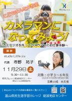 令和7年度後期こどもまんなか教室「カメラマンになってみよう!」 [更新日:2025年8月23日] 令和7年度後期こどもまんなか教室「カメラマンになってみよう!」 ※ 受講にあたってカメラは持参しなくても大丈夫です。 【申込み】 〇窓口申込:申込書に受講料を添えて、砺波地区センター窓口へ。 〇インターネット申込:下記より申込Webサイト(ekaiinサービス)にて申込 申込期間は10月25日(土)から インターネット申込はこちらから ファイル こどもまんなか教室「カメラマンになってみよう!」 [1.69 MB] PDFファイルをご覧になるには、Adobe Acrobat Readerが必要です。こちらのバナーから無料でインストールできます。 お問い合わせ先 砺波地区センター 〒932-0114 小矢部市清水95-1 電話番号:0766-61-2020 FAX番号:0766-61-2008